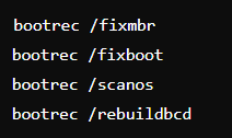 이 명령어들은 마스터 부트 레코드(MBR)를 수정하고 부트 섹터를 다시 작성하여 부팅 문제를 해결합니다.